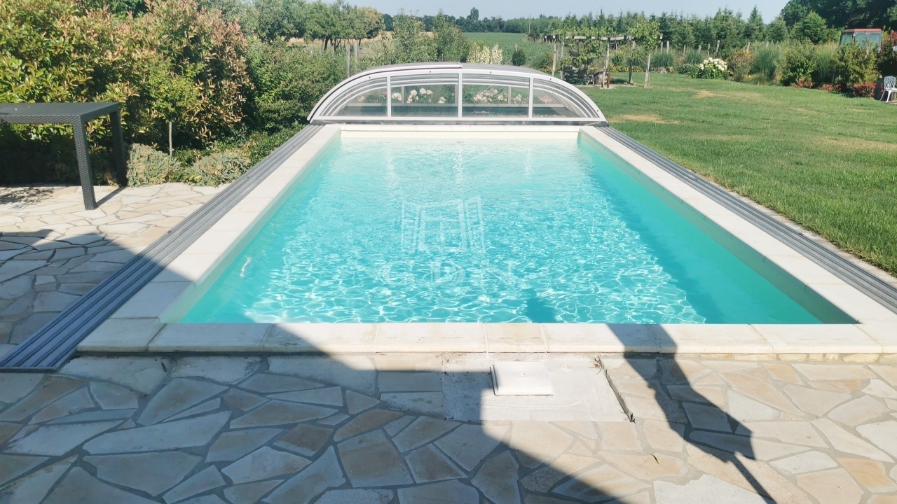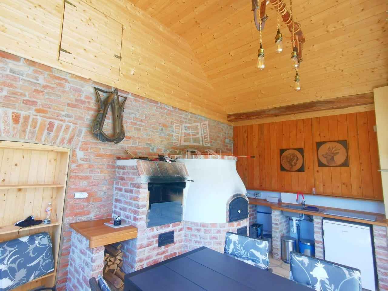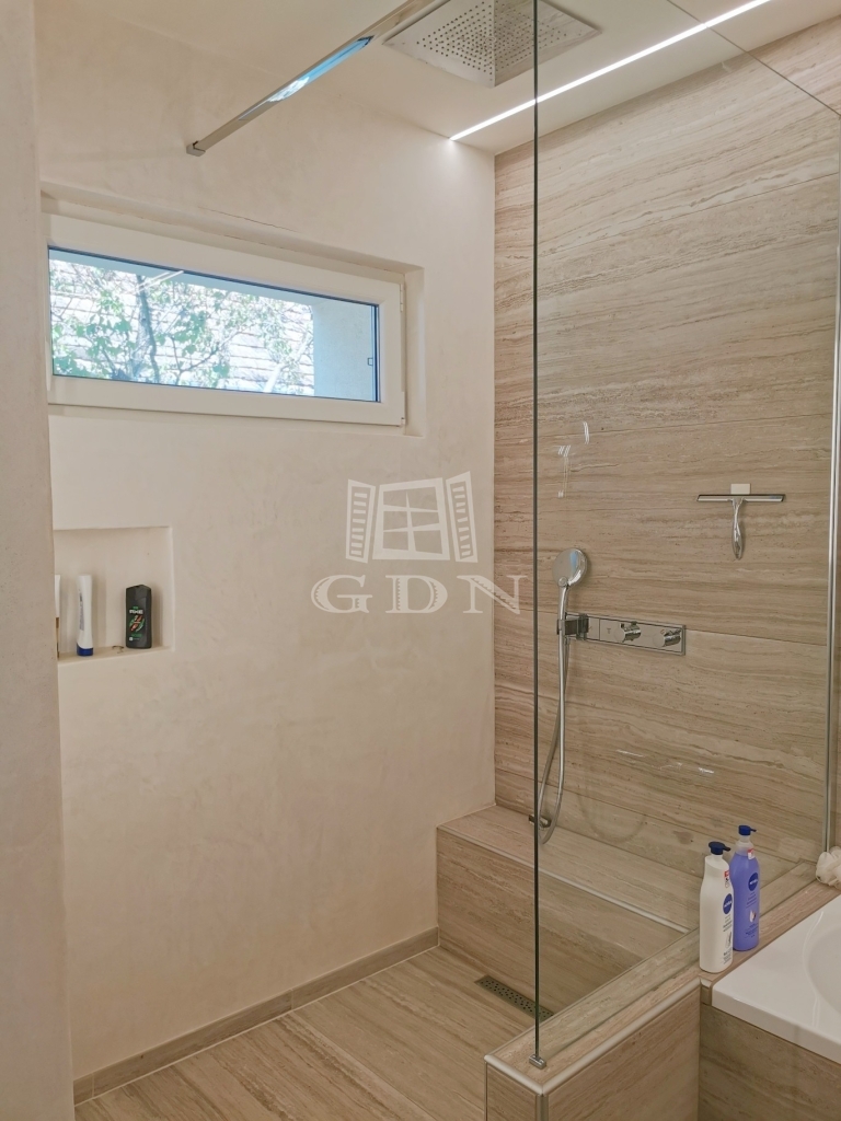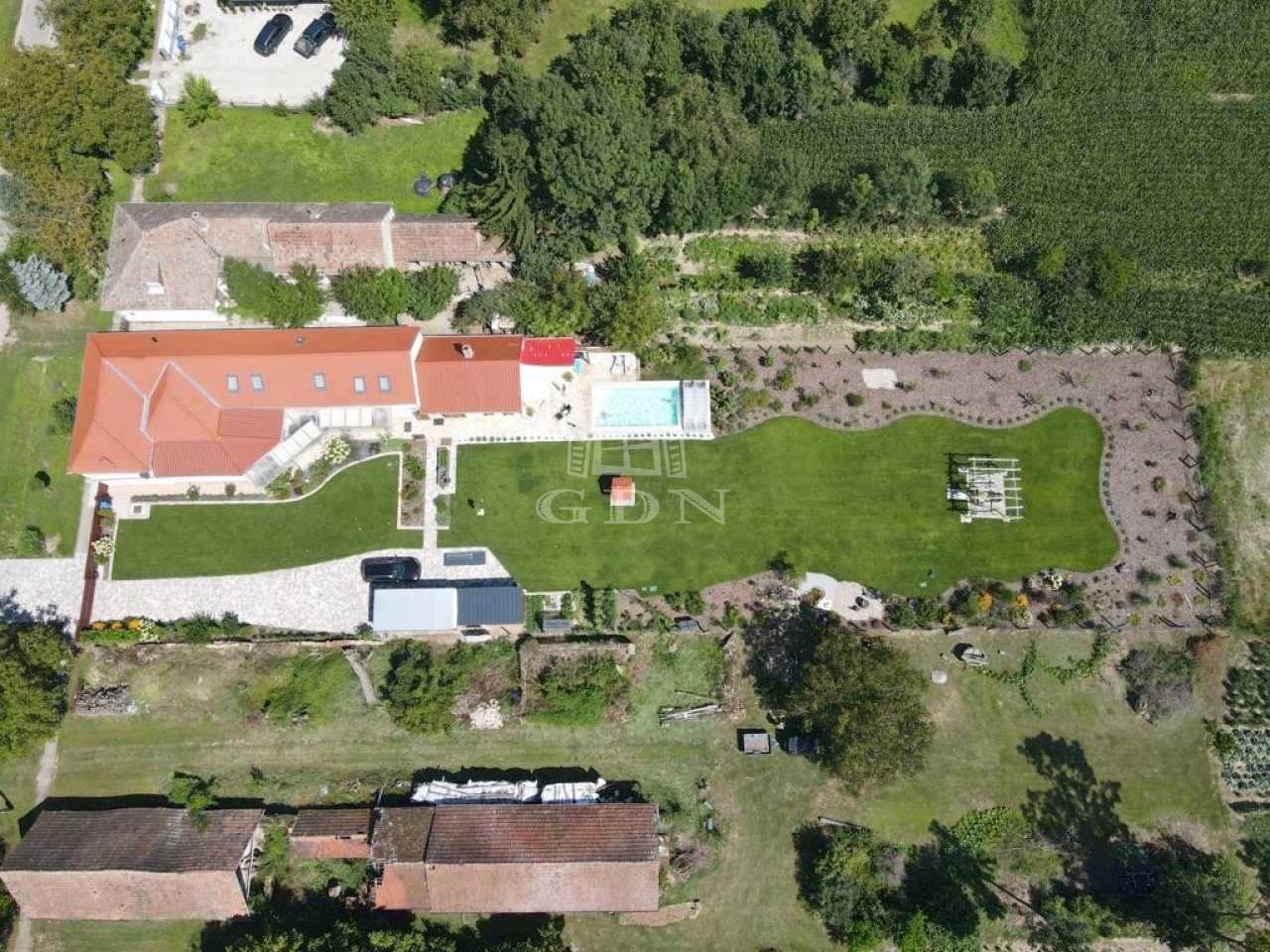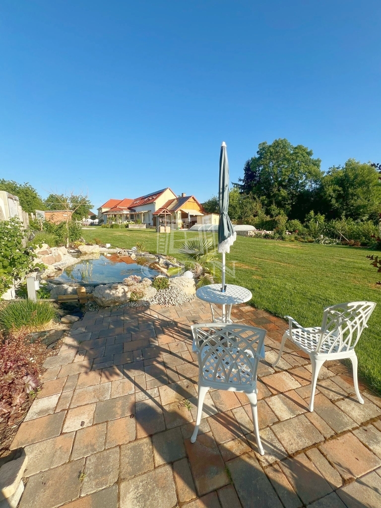 A fedett, fűthető és hűthető medence (7 x 3,5 m) egész évben használható. Ehhez kapcsolódik egy kültéri zuhany, valamint egy fedett grillrész pizza kemencével – tökéletes helyszín baráti összejövetelekhez vagy csendes pihenéshez. A kert kialakítása átgondolt: automata öntözőrendszer kúttal, gondozott zöldfelületek, kerti tó és robotfűnyíró biztosítják a kényelmet és az esztétikus megjelenést.