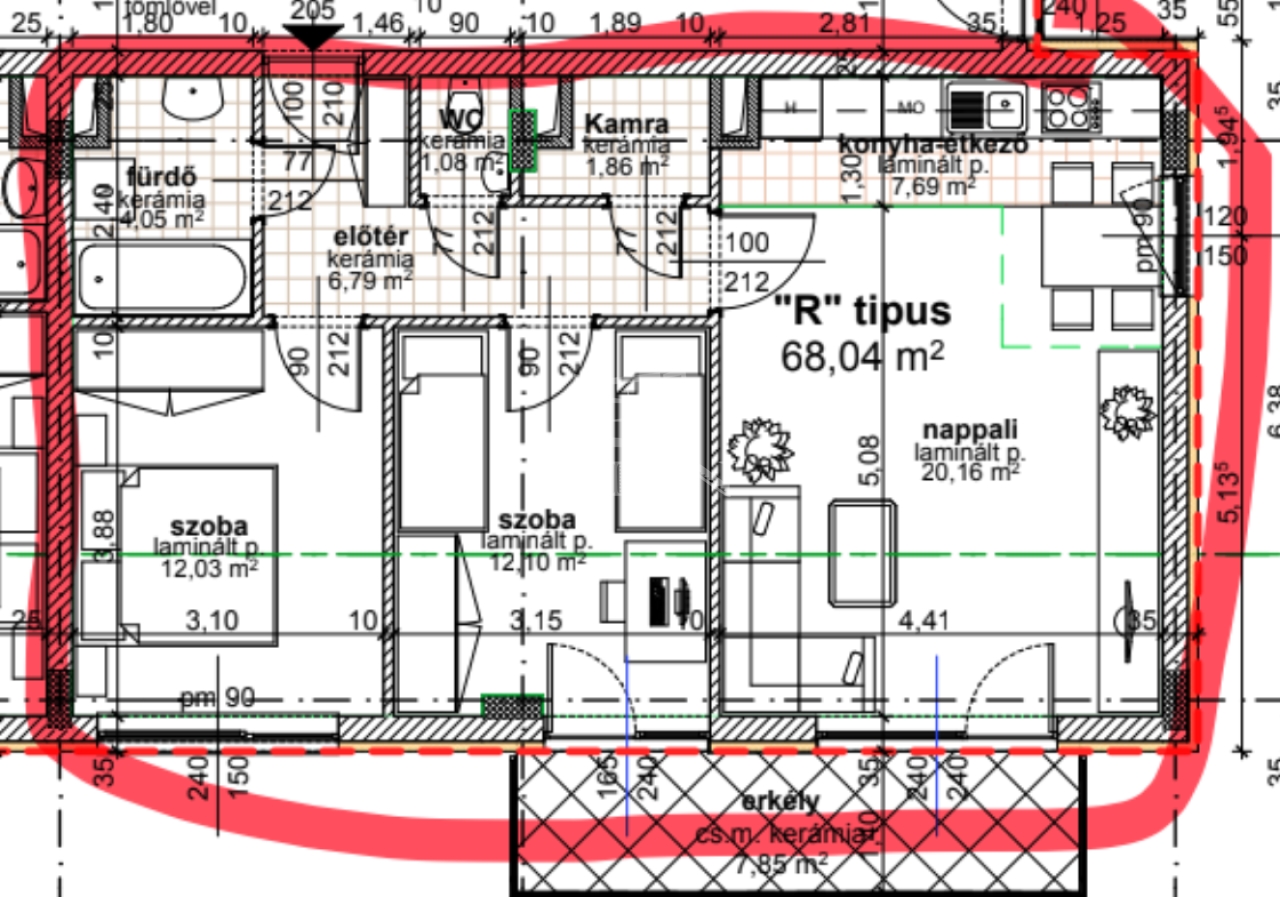 A 65 m²-es lakótérhez egy 8 m²-es terasz tartozik. Az elrendezés praktikus és jól kihasználható: amerikai konyhás nappali, két külön nyíló szoba, zuhanyzós fürdőszoba, külön WC, valamint egy háztartási helyiség is rendelkezésre áll.