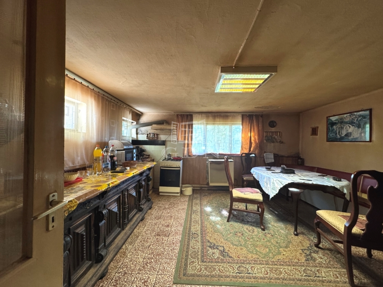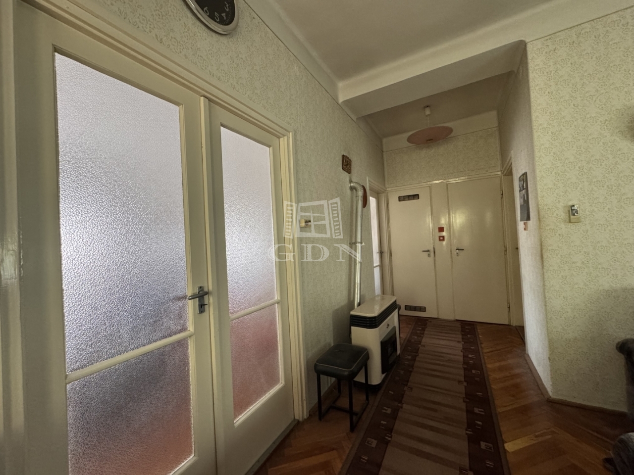 Belső fényképek a felső szint helyiségeiről nem készültek a tulajdonos kérésére. A közlekedő részben és a szobákban, nappaliban jó állapotú halszálkamintás parkettával, nagy ablakokkal. A fürdőszobában is eredeti burkolatok vannak, de jó állapotúak, kék színűek. Ezen a szinten a konyha nincs bebútorozva (jelenleg az alsó szinten található konyha van használatban), de a kiállások és a csempe megmaradt.