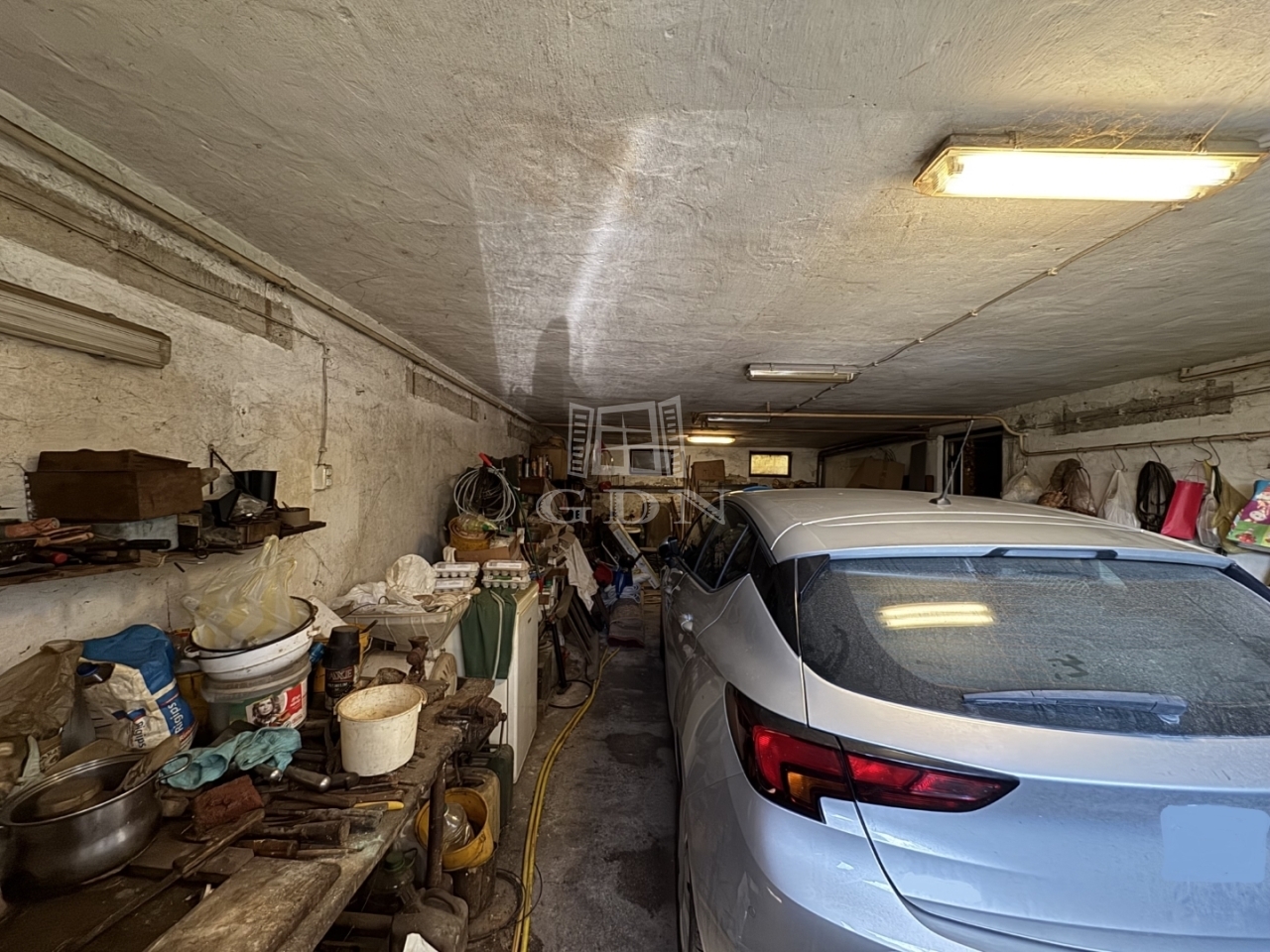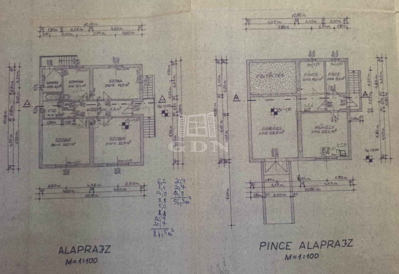 Az alsó (szuterén) részben egy kétállásos garázs, tároló, konyha-étkező, wc található.