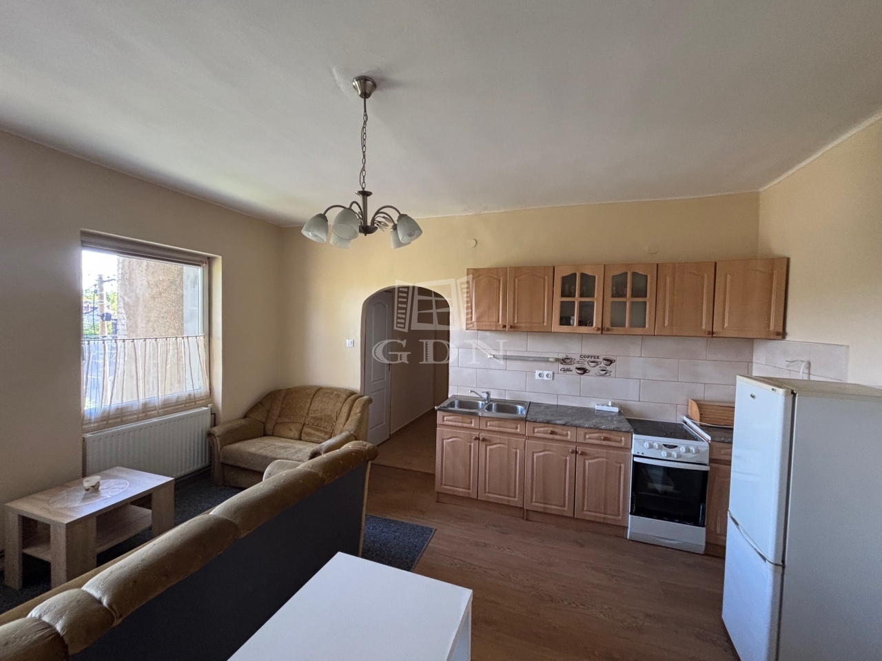 Az ingatlan a 1. emeleten helyezkedik el, 2 szobával és amerikai konyhás nappalival rendelkezik.