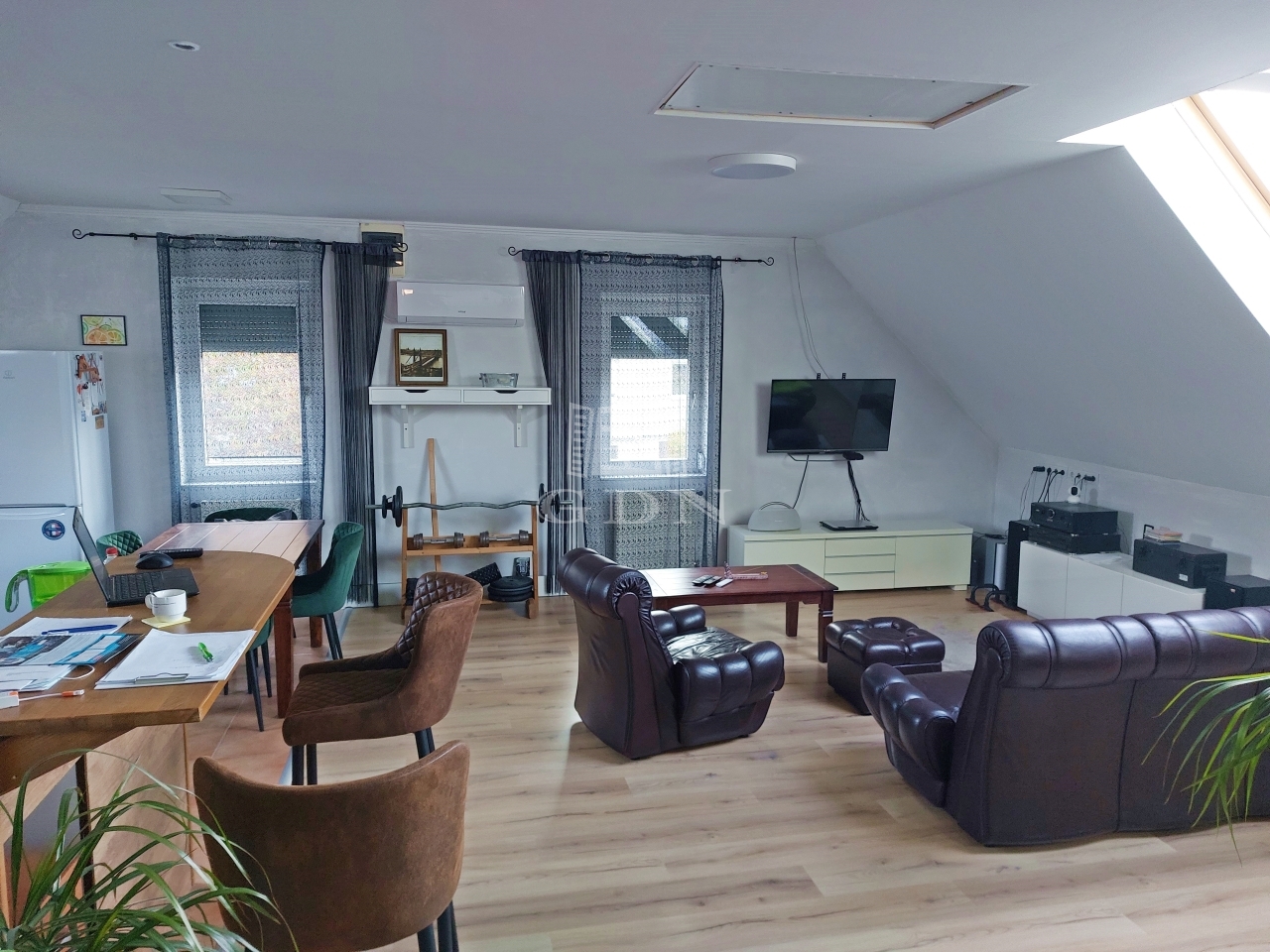 A lakás egy 2 szintes, 2 lakásos jogilag társasházzá alakított (alapító okirattal rendelkező) családi ház 2017-ben kialakított felső szintjén található, külön helyrajzi számmal, külön mérőórákkal és egy 539 nm-es osztatlan közös tulajdonú kerttel.