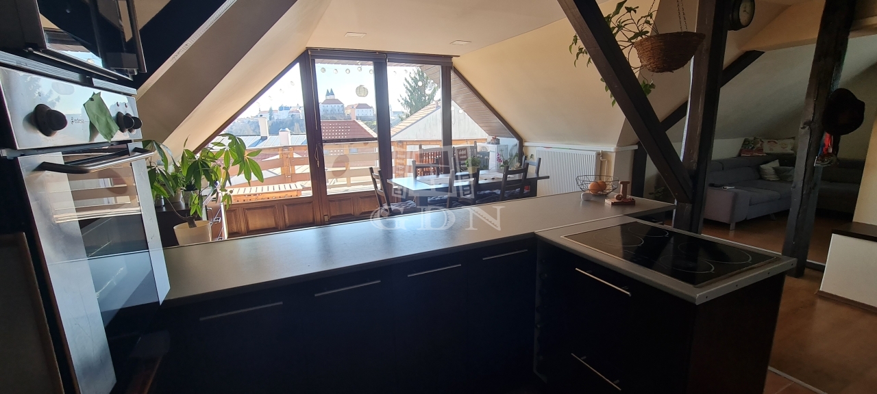 Felső szint: nappali, amerikai konyhás étkező, 3 hálószoba, 2 fürdő WC-vel (egyik zuhanyzós, közvetlen kapcsolattal a hálóhoz), erkély várpanorámával