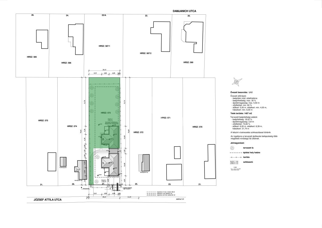 A fedett gépkocsibeálló az utcafronti házhoz tartozik, melynek kizárólagos használatú telekrésze 413 m2. A hátsó háznak 994 m2-es a kizárólagos használatú telekrésze.