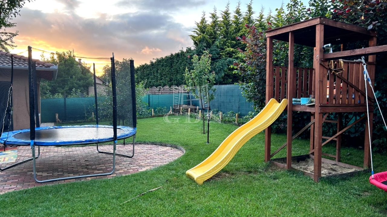 A kert parkosított része a pihenést szolgálja. Gyermekeknek játszótér, veteményes a kertészkedni vágyóknak, biztonságos környezet a kutyusoknak.