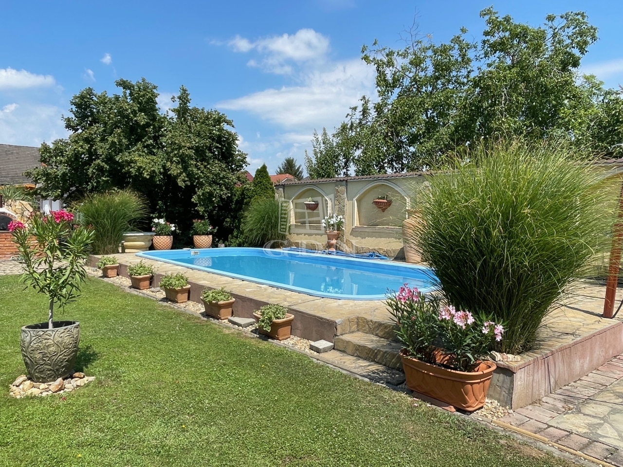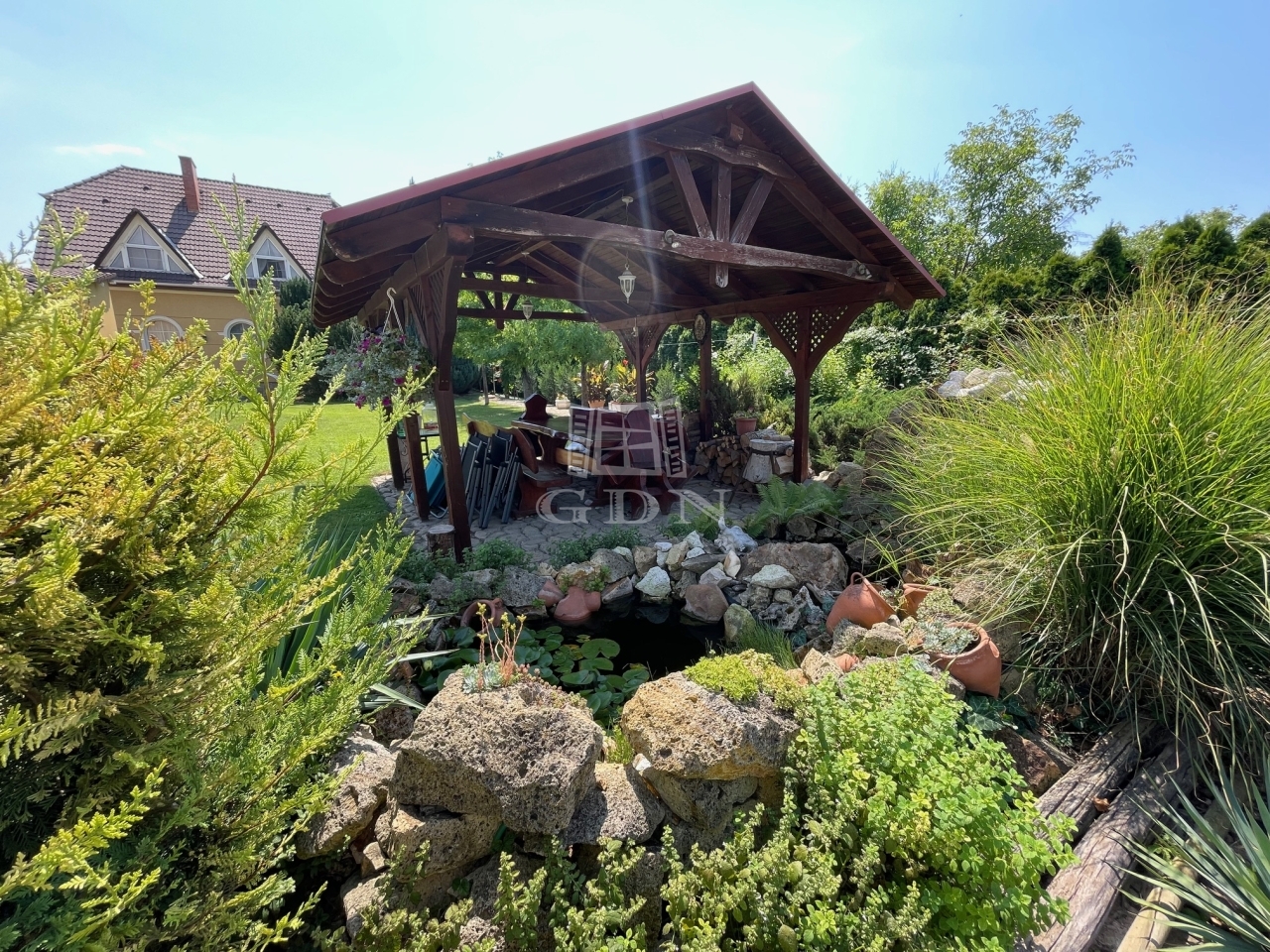 Szépen parkosított kertben, kiépített úszómedence található tisztító, vízforgató rendszerrel ellátva. Továbbá kis hangulatos halastó, pavilon, grillező, kemence helyezkedik el.