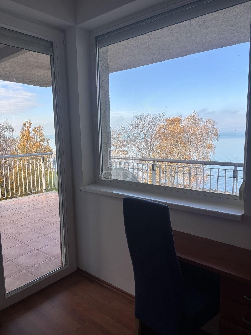 A 16 nm-es terasz fedett, örök panorámás a Balatonra.