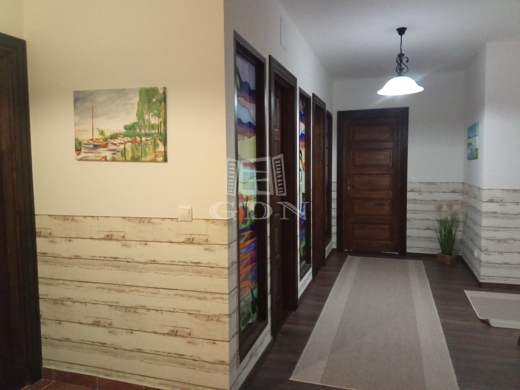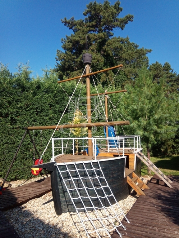 Zamárdi keresett részén, a víztől ötszáz méterre, kényelmesen megközelíthető helyen eladó ez a luxus, számos célra hasznosítható, jelenleg LAKÓHÁZ minősítésű ingatlan. A ház 2017-ben épült minőségi anyagok felhasználásával. Egy gyönyörű parkosított kert öleli, amelyben kerti beálló, pihenő, fedett grillező, egy hatalmas műfüves sportpálya, kis játszótér és egy úszómedence is található. Itt kapott még helyet egy 24 nm területű kerti tároló is, amely akár plusz nyaralóként is funkcionálhat. A ház vízellátását a vezetékes vizen kívül két kút is segíti. A ház kiválóan alkalmas mind állandó lakásra mind üzleti célra. A földszinten egy belépőből nyílik a hatalmas mosókonyhával és beépített bútorzattal ellátott nagy területű garázs. A belépő-közlekedő helyiségből juthatunk fel a ház emeletére, de innen nyílik a tágas és kertkapcsolatos nappali is amelyben helyet kapott egy hangulatos bár is. Ugyancsak a nappaliból nyílik egy kertkapcsolatos hálószoba saját kádas-zuhanyzós fürdővel és vécével, valamint innen nyílik két gardrobe is, továbbá innen juthatunk még egy plusz ugyancsak kertkapcsolatos helyiségbe, amelyben egy télen is használható jacuzzi várja a pihenni vágyókat. A nappali mellett kapott helyet egy tágas konyha étkezővel. Ez is közvetlen kertkapcsolattal bír. A földszinten található még három külön hálószoba saját tusolós fürdővel vécével. A ház emeletén található hat hálószoba, ebből 4 egymásba is nyitható. Itt két hálónak saját fürdőszobája van és van még két külön tusolós fürdő is wc-vel. Itt került kialakításra egy óriási egy légterű hobbi szoba is, amely akár további hálószobákká alakítható. Az épület teljesen légkondicionált. Fűtése alapvetően gázkazánról történik, de lehetőség van a klímákkal vagy kandallóval való fűtésre is. A használati melegvíz ellátást gáz és villany is biztosítja. Az ingatlan beépített bútorzattal (igény szerint teljes bútorzattal) eladó.