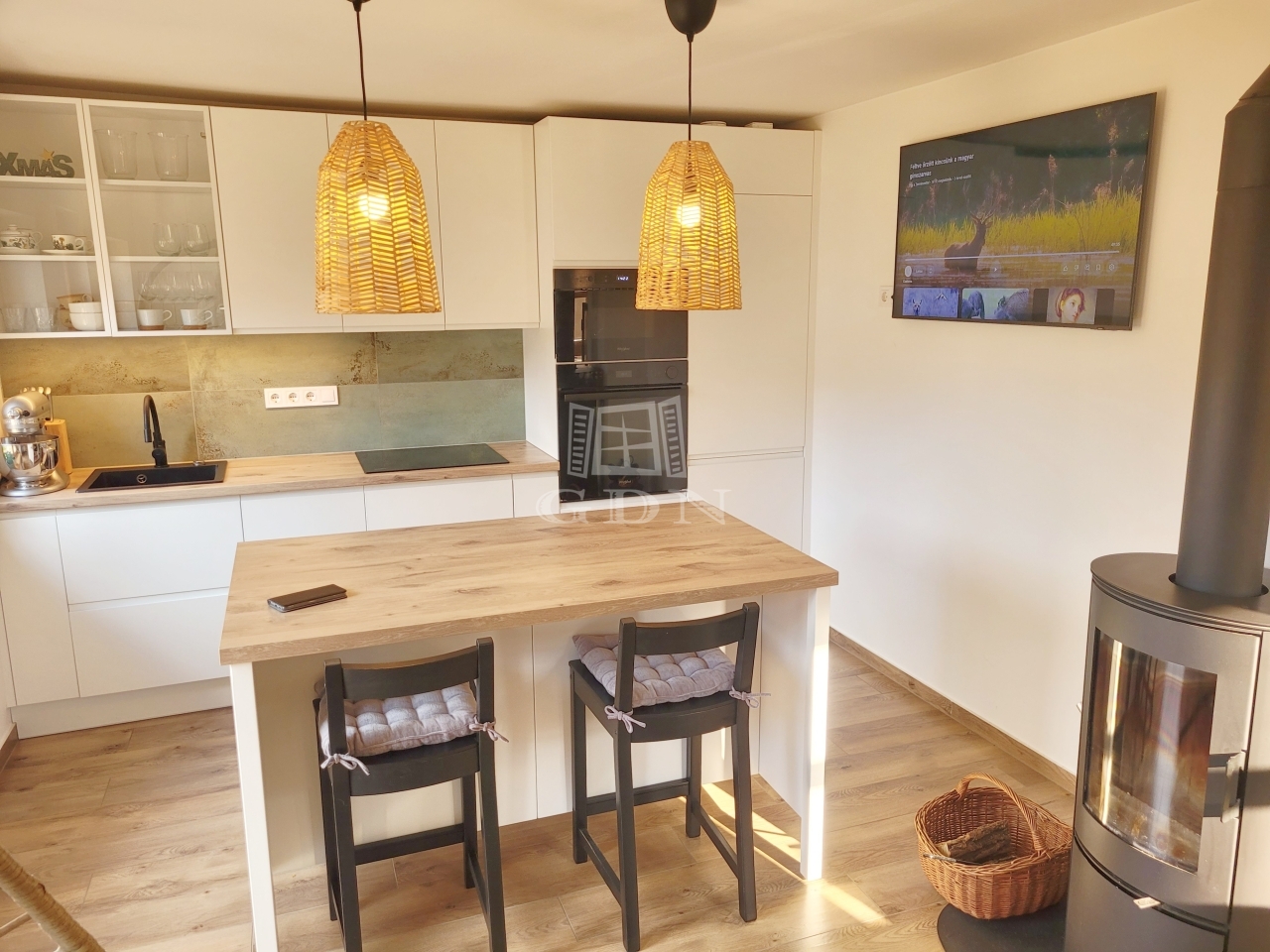 Az első szinten található a konyha és a fürdőszoba. A konyhát egyedileg tervezték és építették be. Ezen kívül egy konyhasziget és egy kis kávésarok is kialakításra került.