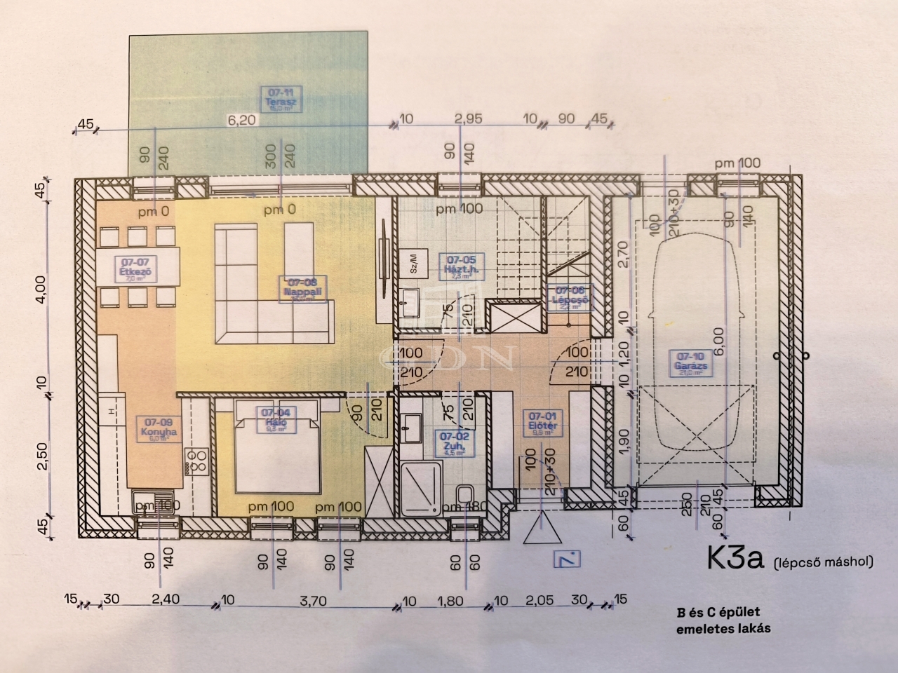 kertrész kb. 200 nm. A garázs teteje monolit födém, járható,